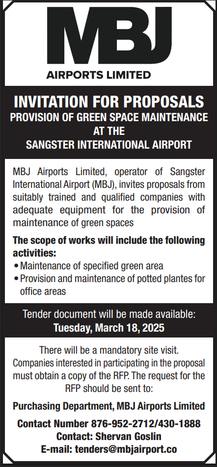 MBJ Airports Limited, operator of Sangster International Airport (MBJ), invites proposals from suitably trained and qualified companies with adequate equipment for the provision of maintenance of green spaces The scope of works will include the following activities: •Maintenance of specified green area •Provision and maintenance of potted plantes for office areas.