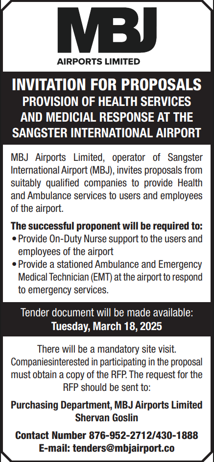International Airport (MBJ), invites proposals from suitably qualified companies to provide Health and Ambulance services to users and employees of the airport.